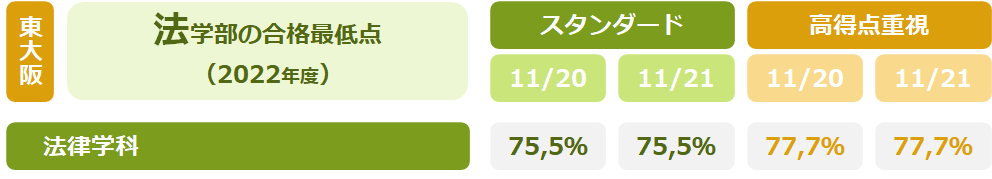 近畿大学法学部のスタンダード方式、高得点科目重視方式での合格最低点は以下の通りです。