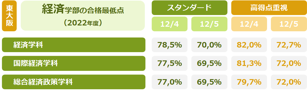 近畿大学経済学部のスタンダード方式、高得点科目重視方式での合格最低点は以下の通りです。