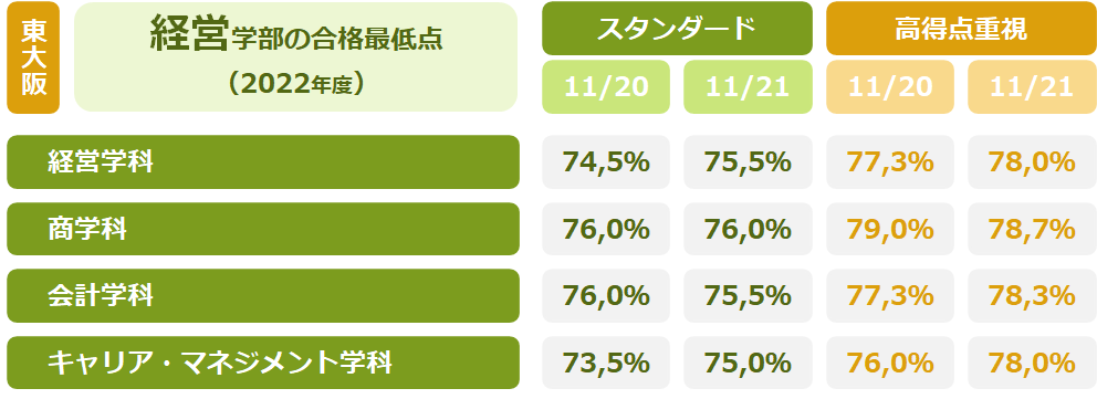 近畿大学経営学部のスタンダード方式、高得点科目重視方式での合格最低点は以下の通りです。