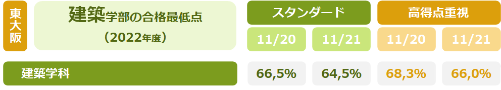 近畿大学建築学部のスタンダード方式、高得点科目重視方式での合格最低点は以下の通りです。