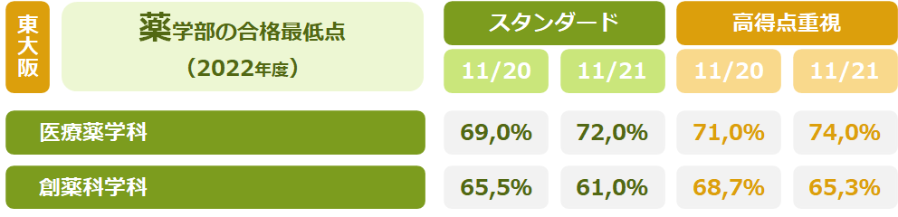 近畿大学薬学部のスタンダード方式、高得点科目重視方式での合格最低点は以下の通りです。