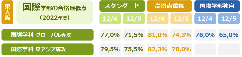 近畿大学国際学部のスタンダード方式、高得点科目重視方式、国際学部独自方式での合格最低点は以下の通りです。