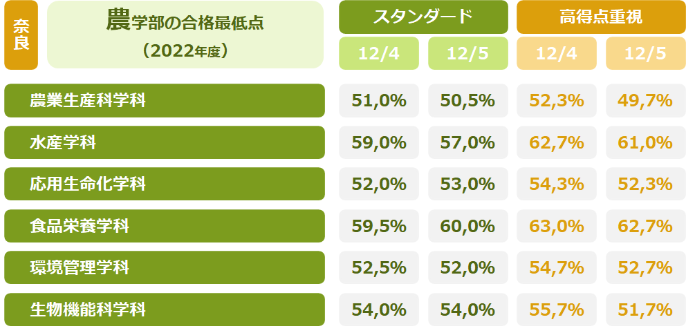 近畿大学農学部のスタンダード方式、高得点科目重視方式での合格最低点は以下の通りです。