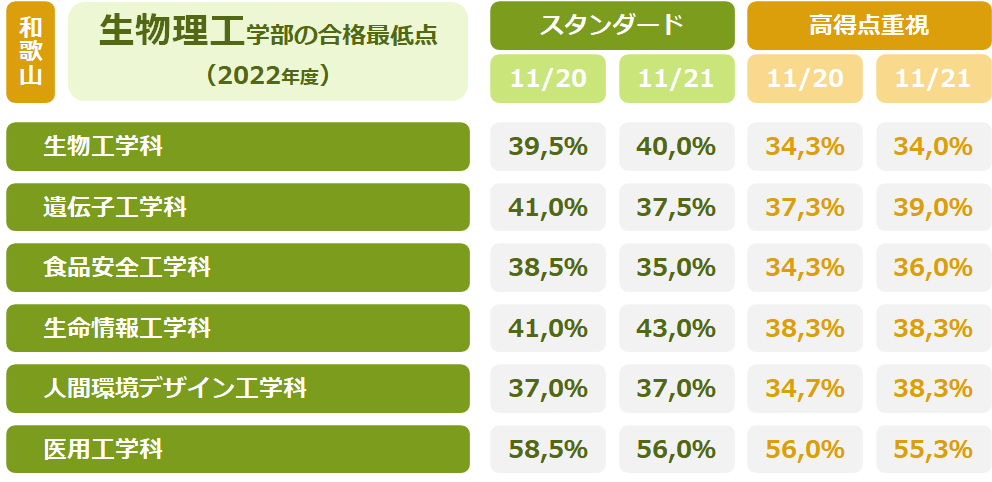 近畿大学生物理工学部のスタンダード方式、高得点科目重視方式での合格最低点は以下の通りです。