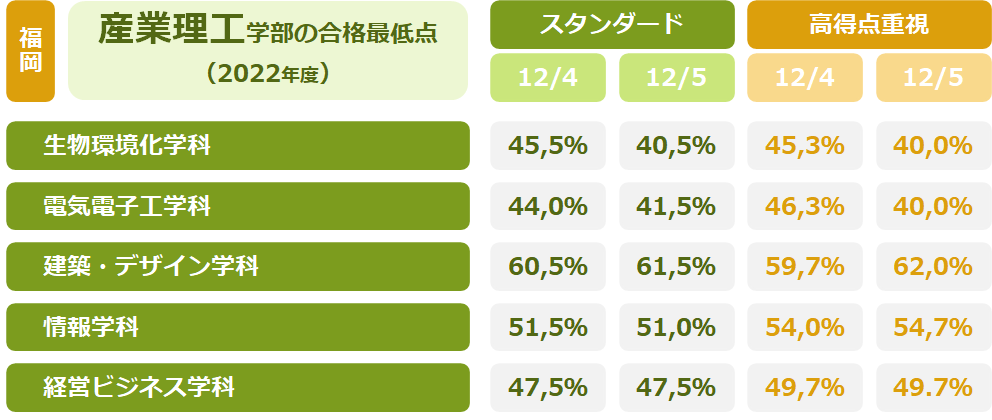 近畿大学産業理工学部のスタンダード方式、高得点科目重視方式での合格最低点は以下の通りです。
