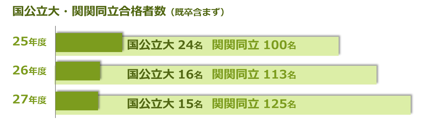 2015年度入試では、国公立大に15名、関関同立に125名が合格。
